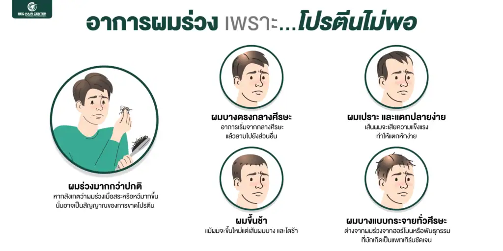 การสังเกตตัวเองสามารถช่วยแยกได้ว่าผมร่วงเกิดจากขาดโปรตีนหรือสาเหตุอื่น อาการสำคัญ ได้แก่: