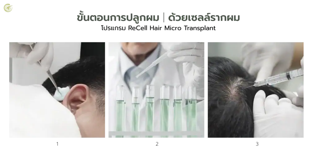 ReCell® คือการฟื้นฟูเส้นผมด้วยเซลล์รากผมของตัวเอง เป็นโปรแกรมที่ไม่ใช่การปลูกผมย้ายรากแบบ FUE หรือ DHI แต่คือการ “สกัดเซลล์รากผมที่แข็งแรง” แล้วนำกลับไปกระตุ้นบริเวณที่ผมบาง โดยเซลล์รากผมที่สกัดออกมาจะมีหน้าที่ในการปกป้อง ซ่อมแซมรากผมจากฮอร์โมน DHT ทำให้ผมร่วงน้อยลง รากผมกลับมาแข็งแรง และยังทำให้เส้นผมมีการเจริญเติบโตขึ้นมาใหม่อีกครั้ง
